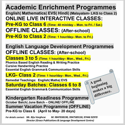 After-school Programme (Online) Pre-school Programme (Online) Vacation Programme (Offline) Kindergarten Programme (Offline) After-school Programme (Offline) Weekend Classes (Offline) Teacher Development Workshop